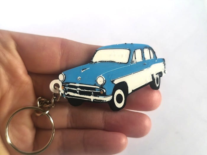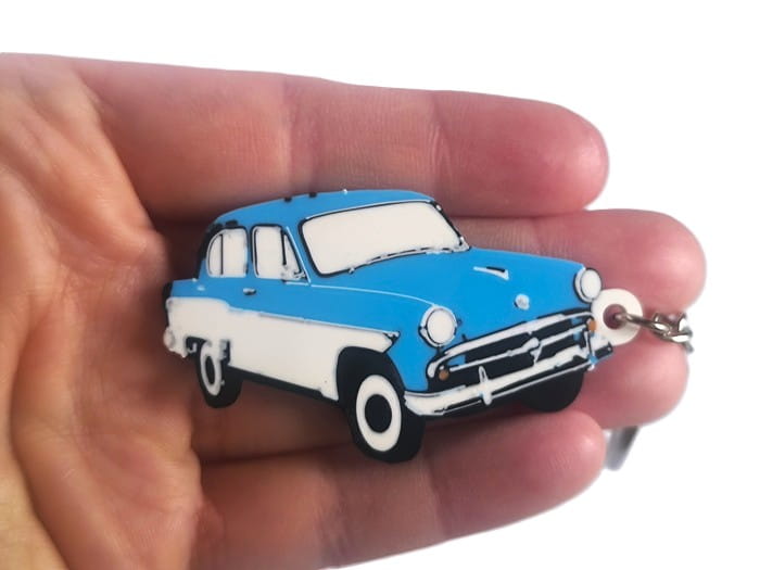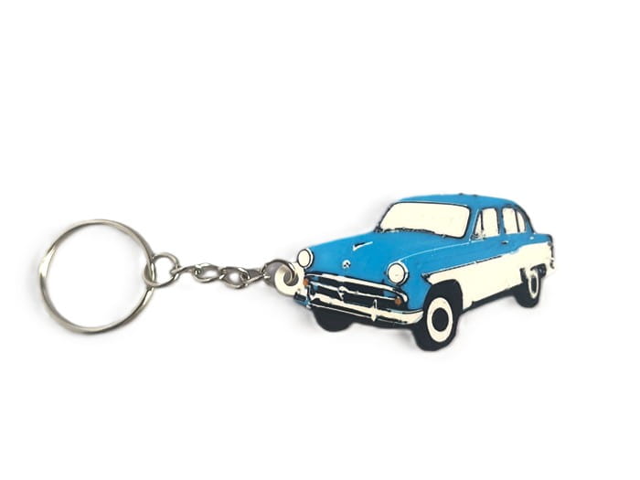 Stylowy brelok inspirowany kultowym radzieckim samochodem Moskwicz, produkowanym przez Moskiewską Fabrykę Samochodów Małolitrażowych w latach 1956–1958. Ten model, mimo krótkiej historii, stał się ikoną designu lat 50. i symbolem epoki samochodów z chromowanymi detalami.