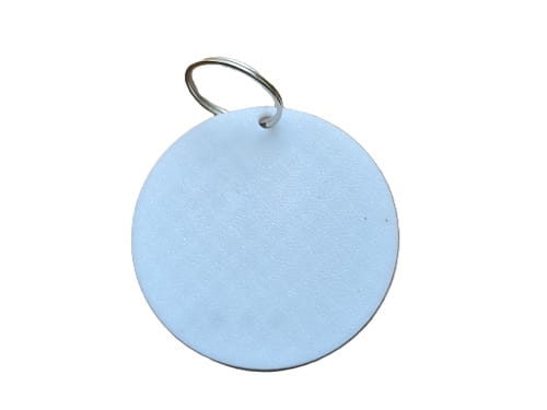 Okrągły brelok w dwóch kolorach. Biało - czarny z logiem Zakładów Radiowych Kasprzaka