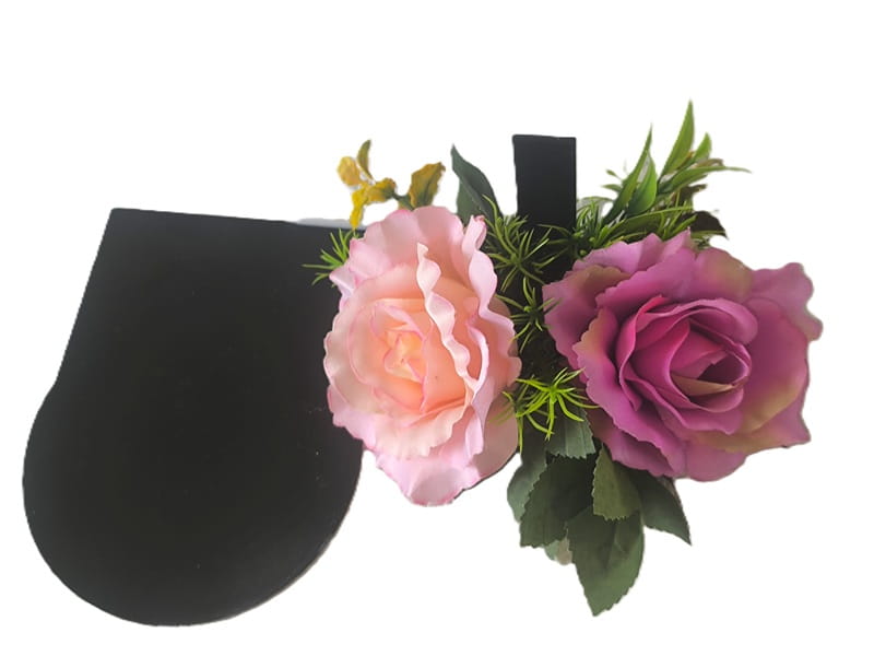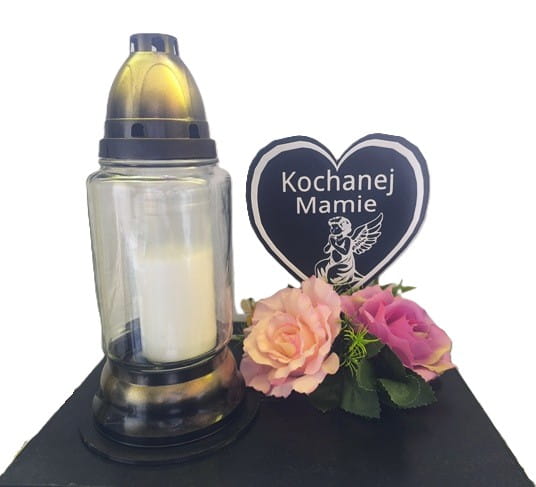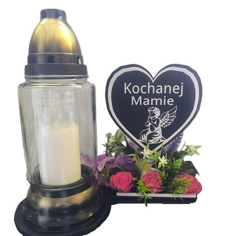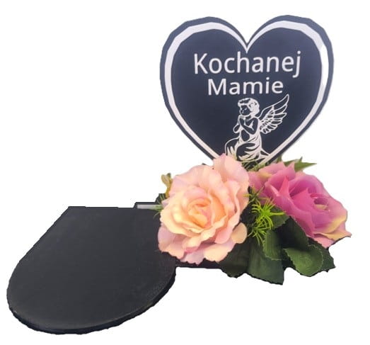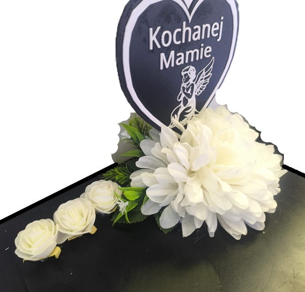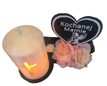 Elegancka ozdoba cmentarna wykonana metodą druku 3D, idealna do ustawienia pod zniczem. Podstawa z sercem i napisem, który możesz wybrać w wariantach, została ozdobiona ręcznie przyklejanymi kwiatami sztucznymi, tworząc wyjątkowy i trwały stroik nagrobny.