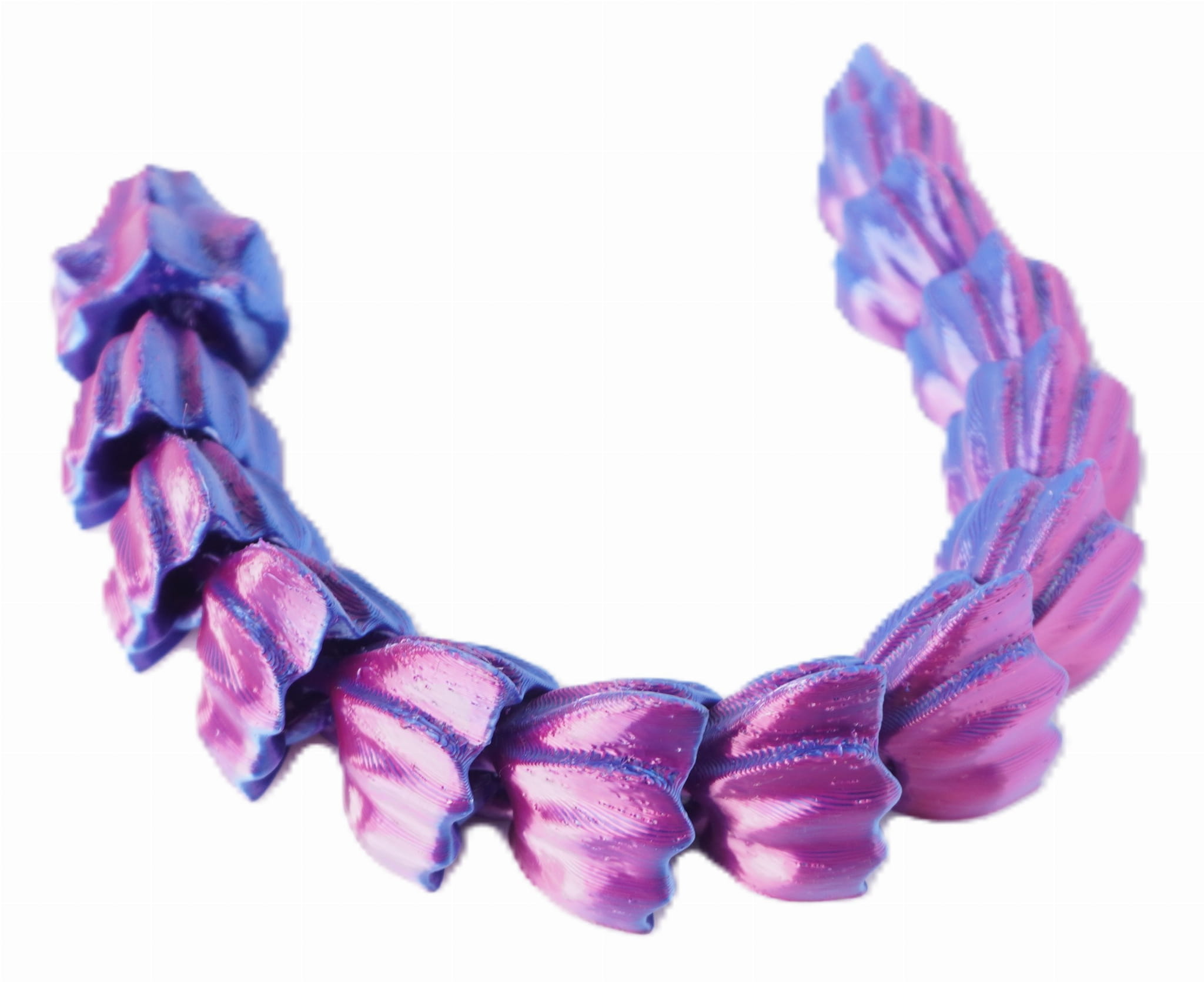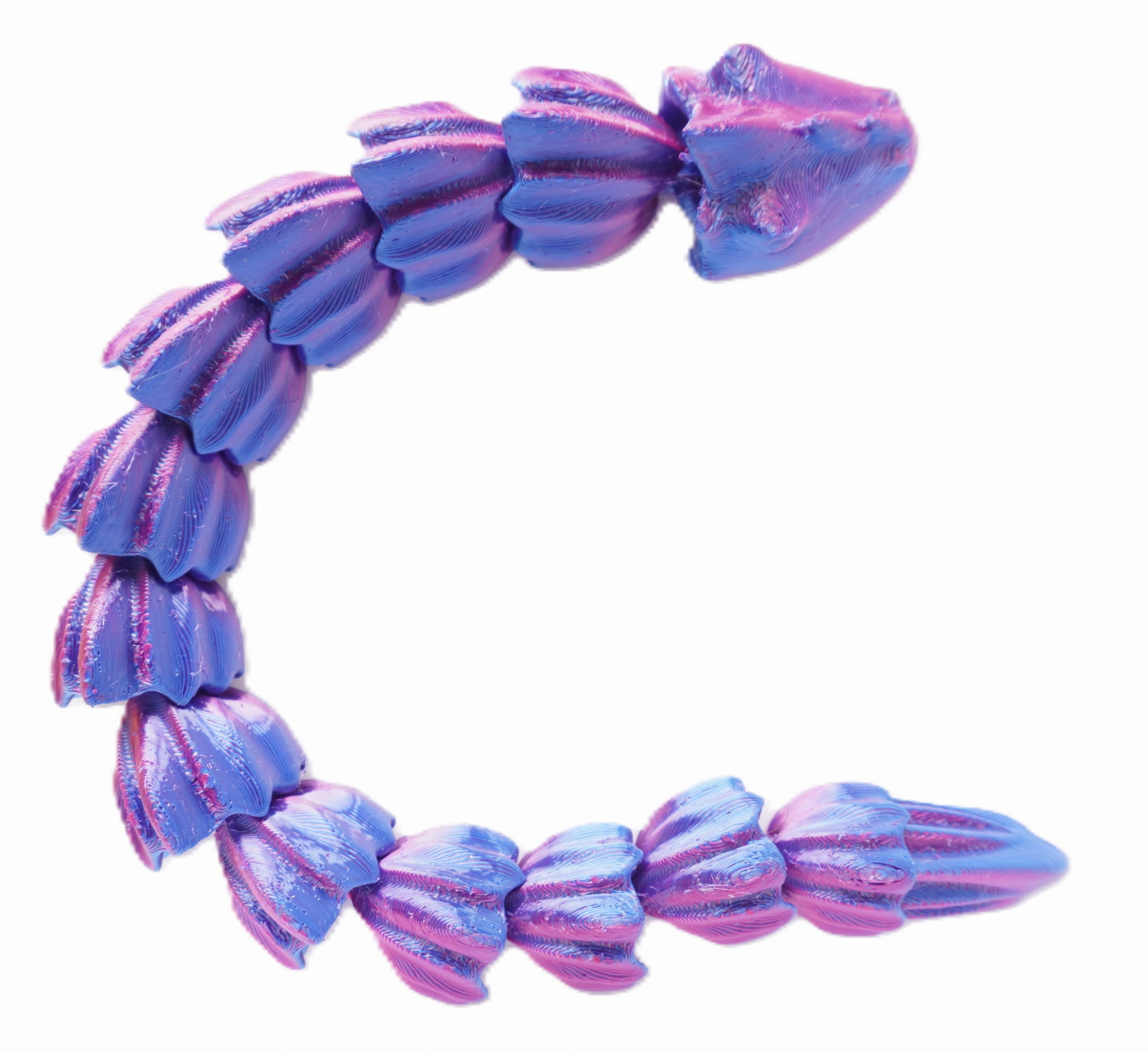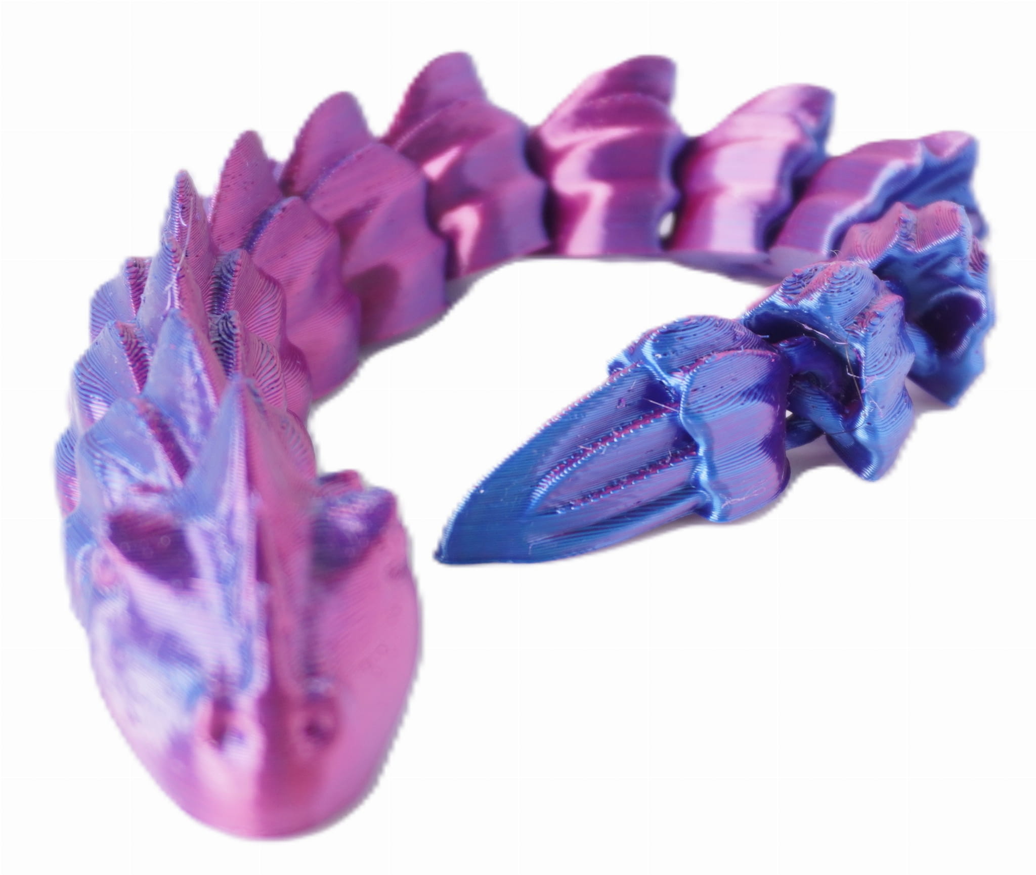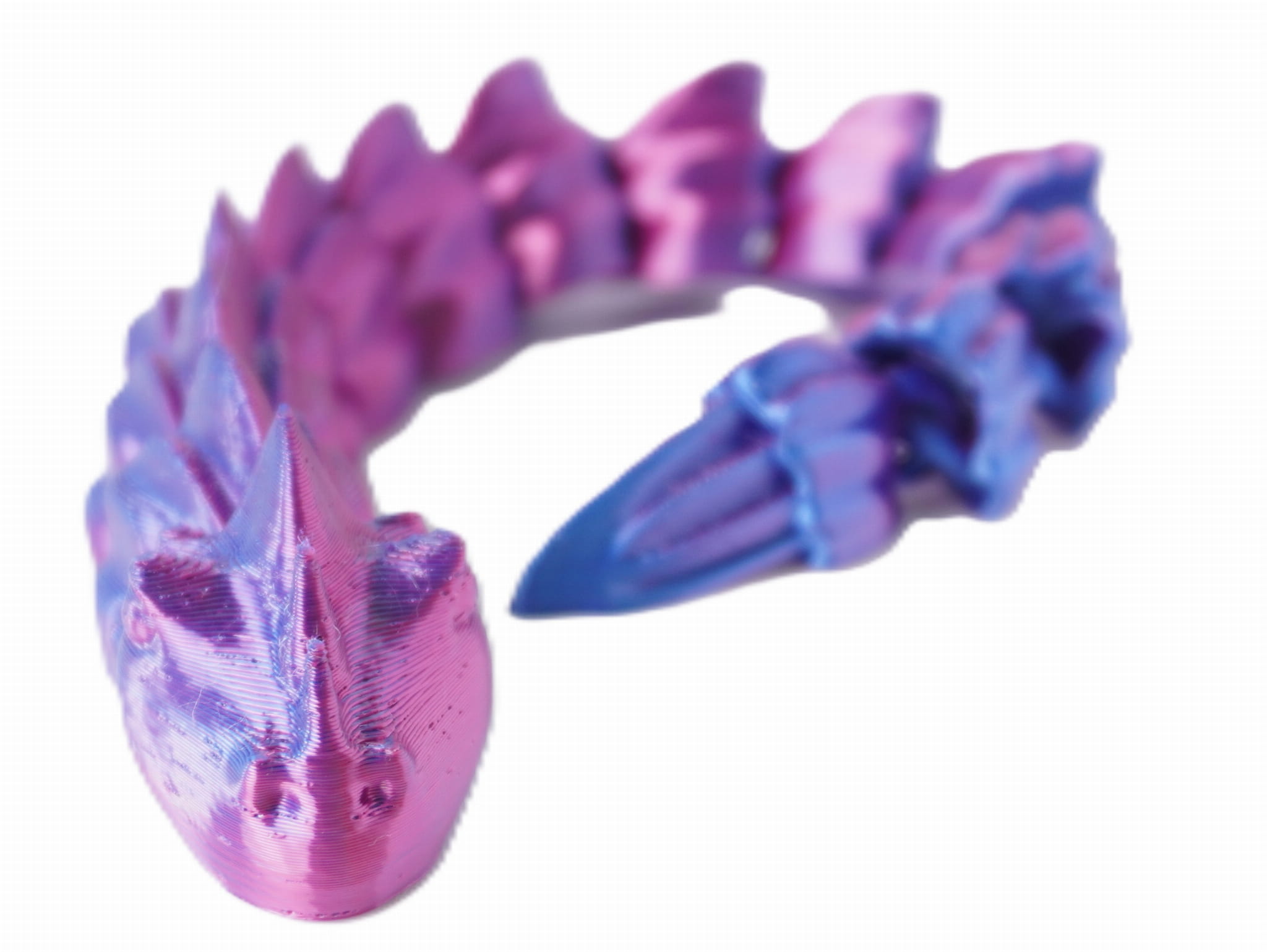 Wydruk wykonany z dwukolorowego filamentu, co nadaje smokowi unikalny, mieniący się wygląd – barwy przenikają się wzdłuż całej jego długości, tworząc efekt zmiany koloru w zależności od kąta patrzenia.