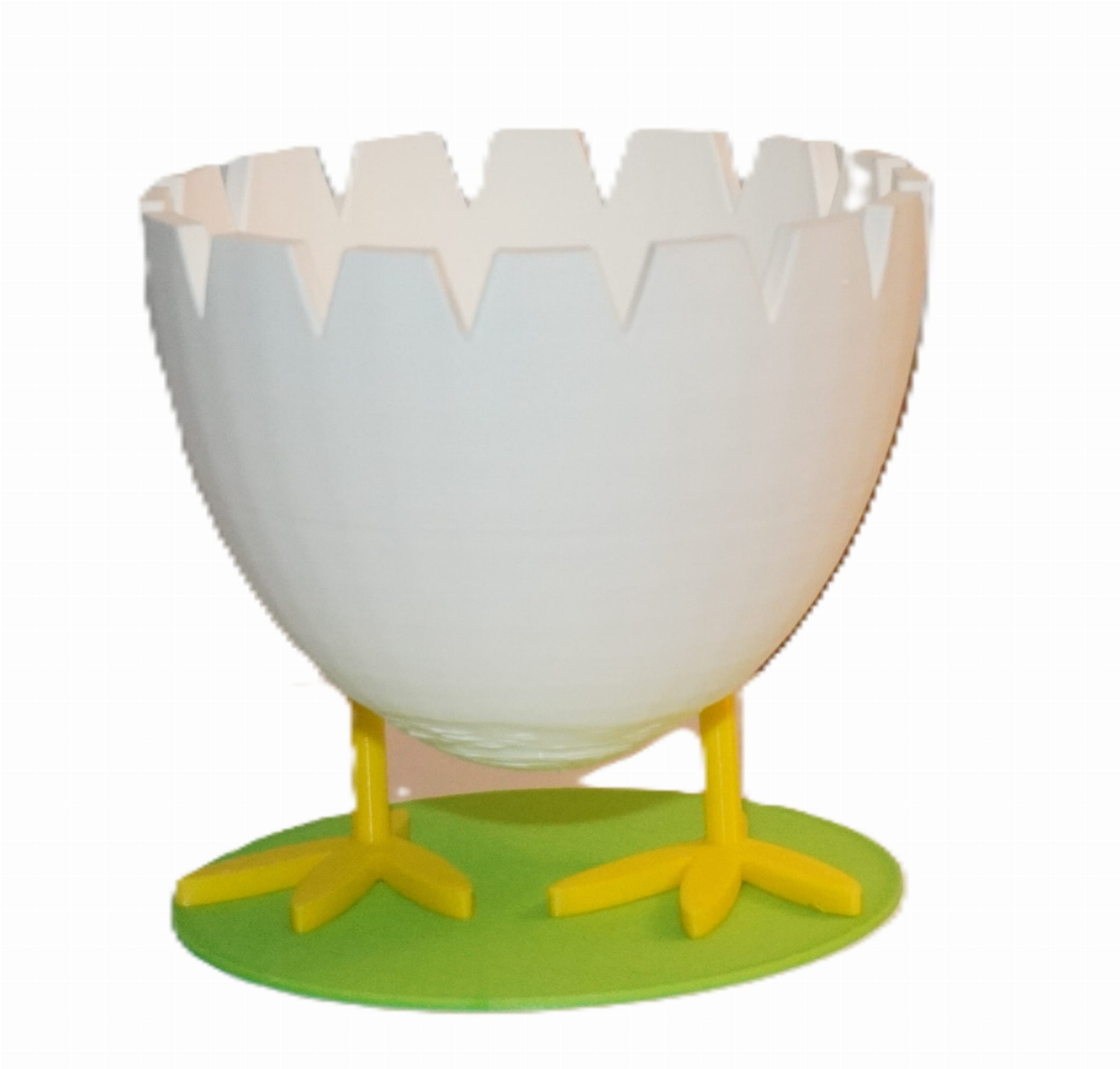 - wesoły design: biała skorupka na żółtych nóżkach ustawiona na zielonej podstawce,