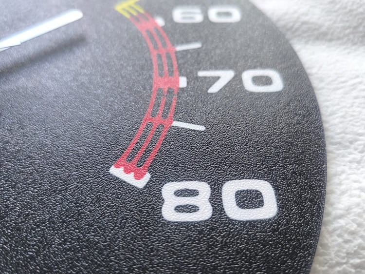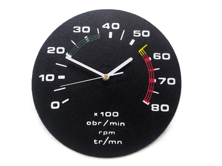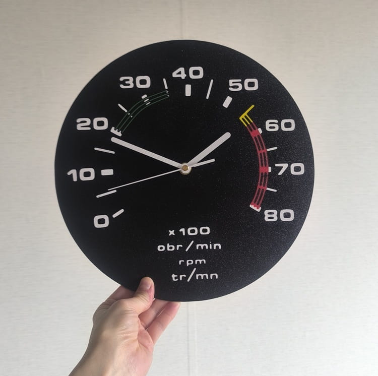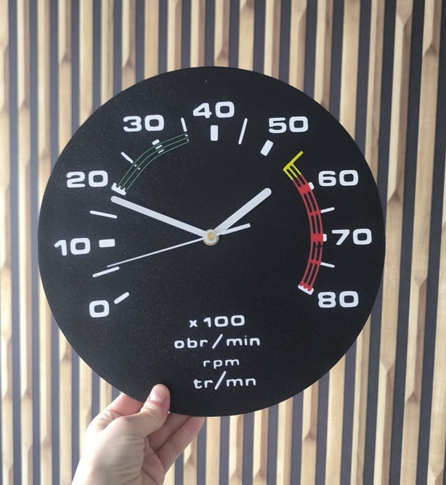 - Design: wiernie odwzorowany wygląd obrotomierza z Fiata 125p, z charakterystyczną skalą obrotów, kolorowymi polami i oznaczeniami „obr/min” oraz „rpm”.