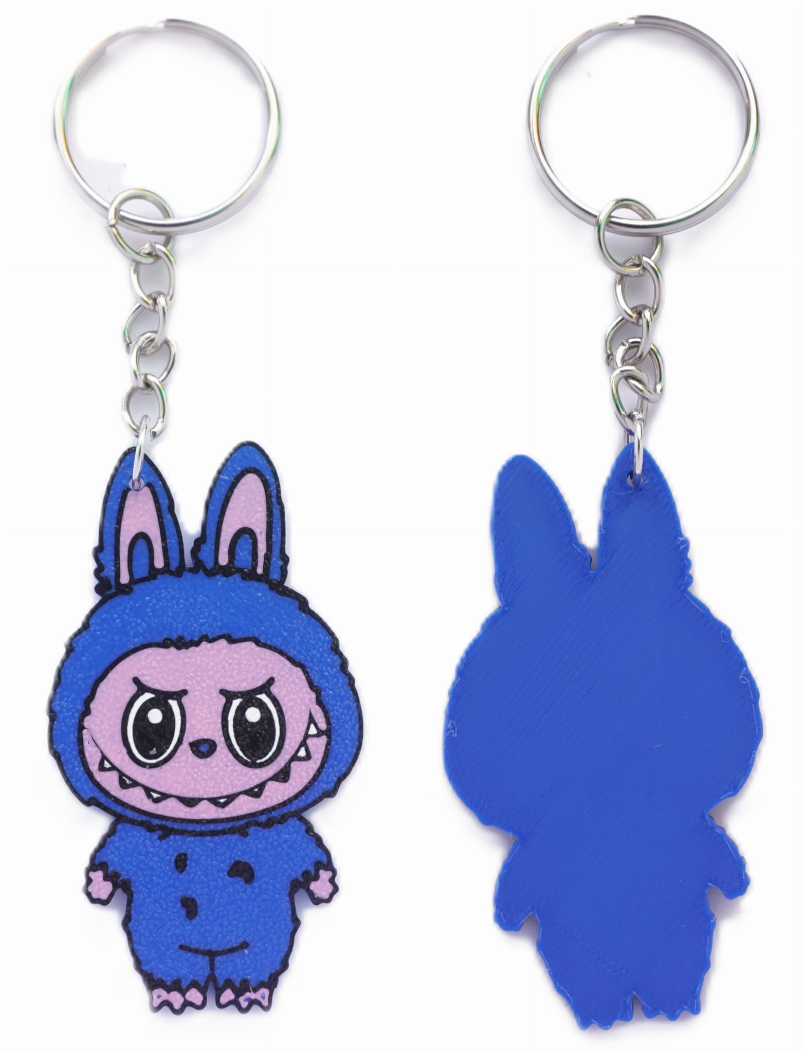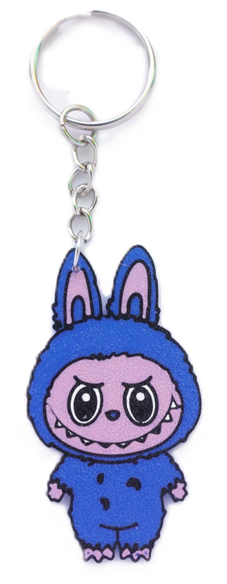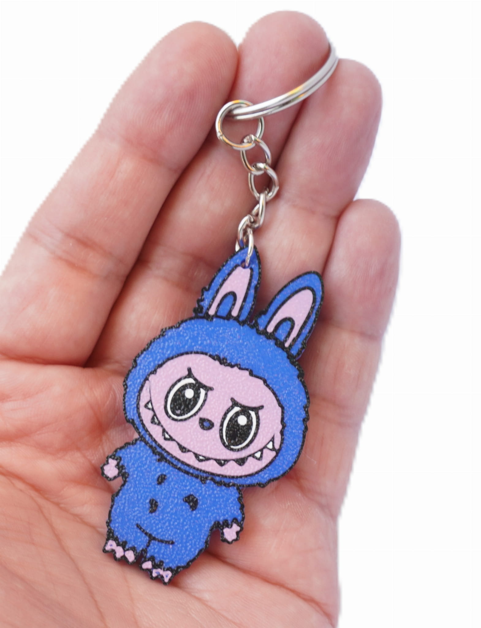 Poznaj Labubu – uroczego potworka z charakterkiem! W tej wersji jako brelok 3D, Labubu nosi kultowy niebieski strój z króliczymi uszami i patrzy swoimi wielkimi oczami, jakby właśnie coś zmajstrował... albo planował. Zęby wystają, uśmiech nieco psotny – nie da się go nie polubić!